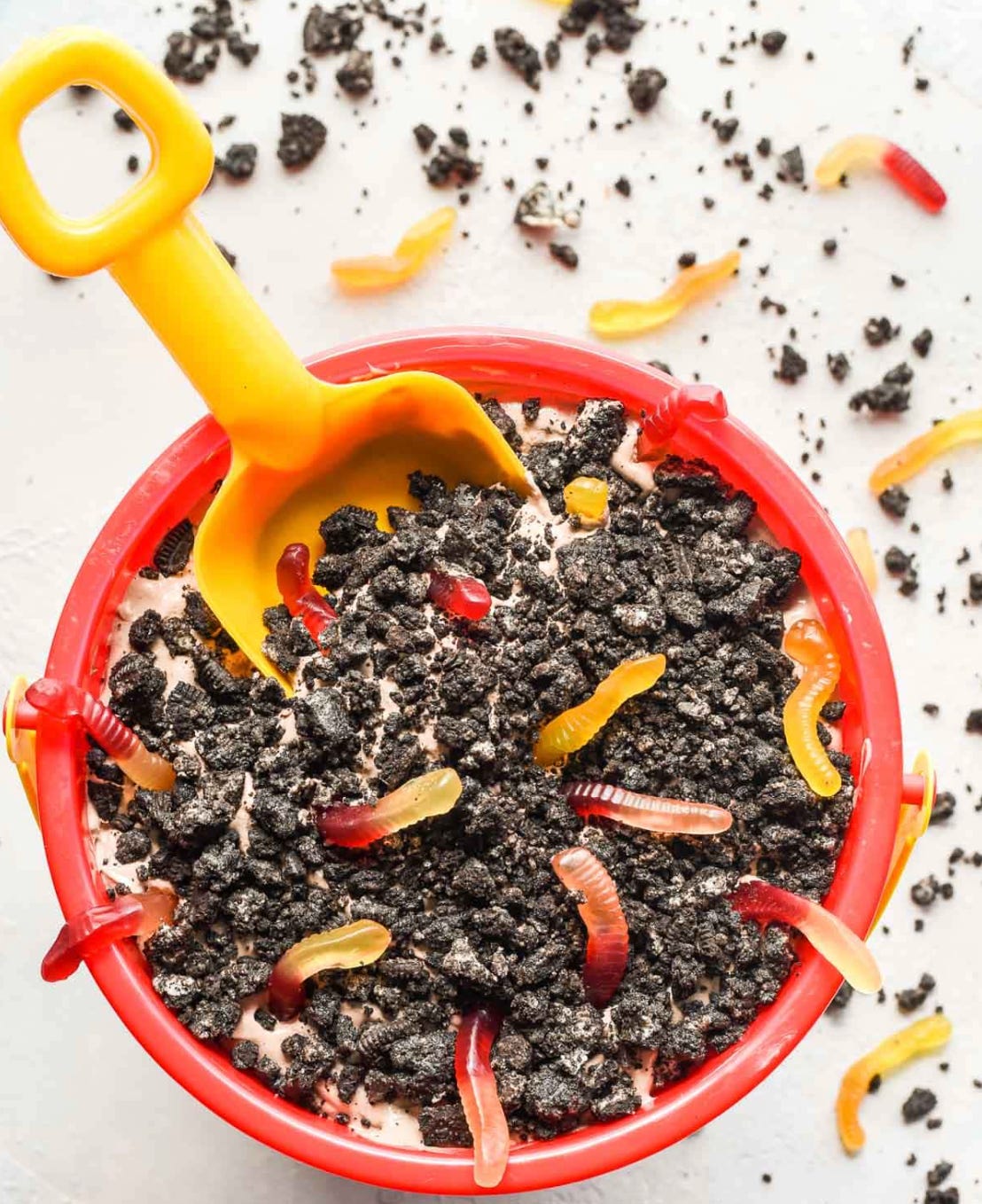 Prepare the Oreo "dirt": Crush the Oreos (filling included) into fine crumbs. You can use a food processor or a rolling pin in a sealed bag. Set aside 1/2 cup of crumbs for the top layer.